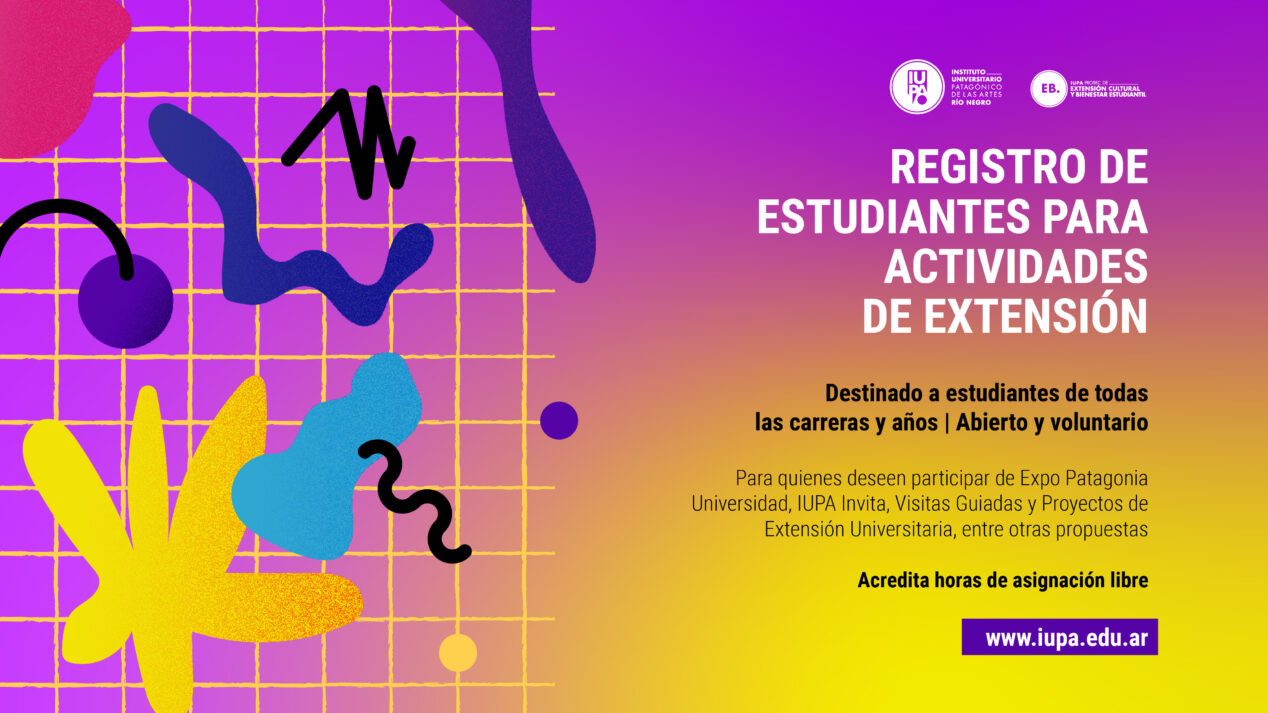 Como estudiante, podés formar parte de los equipos que gestan IUPA Invita, capacitaciones y charlas del área, la Expo Patagonia Universidad y otras propuestas que te vincularán con la comunidad educativa y con la sociedad en general. También, formar parte del equipo de Visitas Guiadas y participar en Proyectos de Extensión Universitaria (PEU).