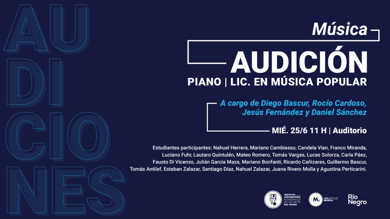 La Cátedra de Piano de la Licenciatura en Música Popular del IUPA, a cargo de los docentes Diego Bascur, Rocío Cardoso, Jesús Fernández y Daniel Sánchez, realizará una audición en la que participarán gran número de estudiantes de todos sus niveles.