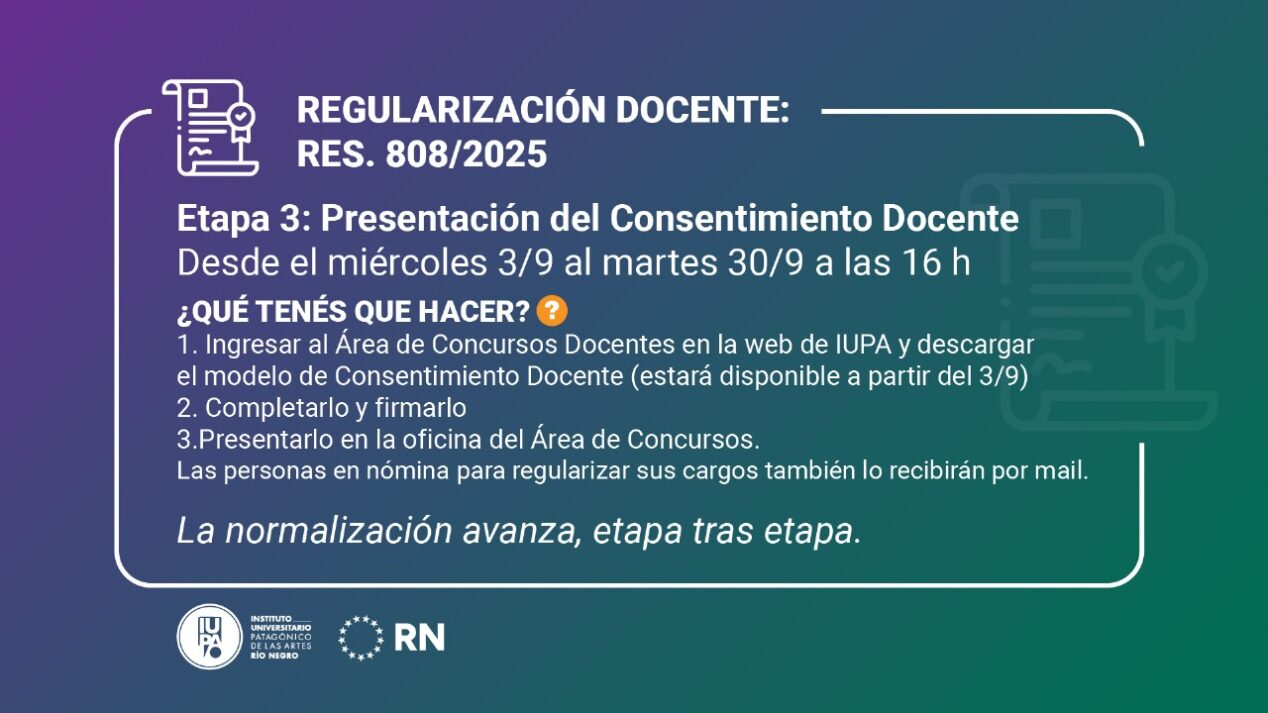 Con la Resolución 808/2025, la universidad continúa avanzando en el proceso de normalización y regularización docente. Tras haberse cumplido las dos primeras instancias —la publicación de la nómina de docentes y la rectificación de datos personales e impugnaciones—, comienza ahora la etapa 3: Presentación del Consentimiento Docente.