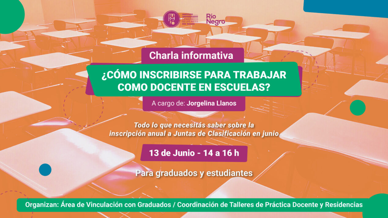 En el marco del período anual de inscripción a Juntas de Clasificación, el Área de Vinculación con Graduados y la Coordinación de Talleres de Práctica Docente y Residencias del IUPA organizan una charla informativa destinada a graduados y estudiantes avanzados que deseen desempeñarse como docentes en escuelas públicas de la provincia de Río Negro.
