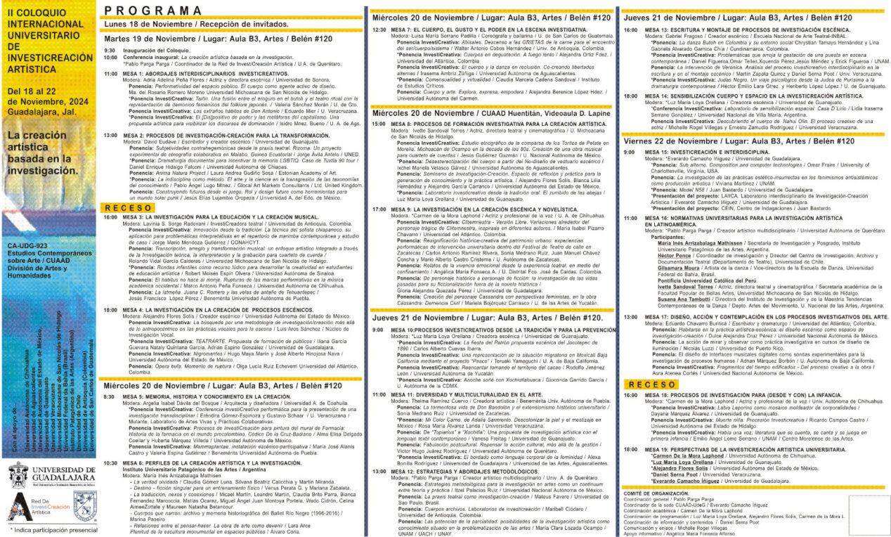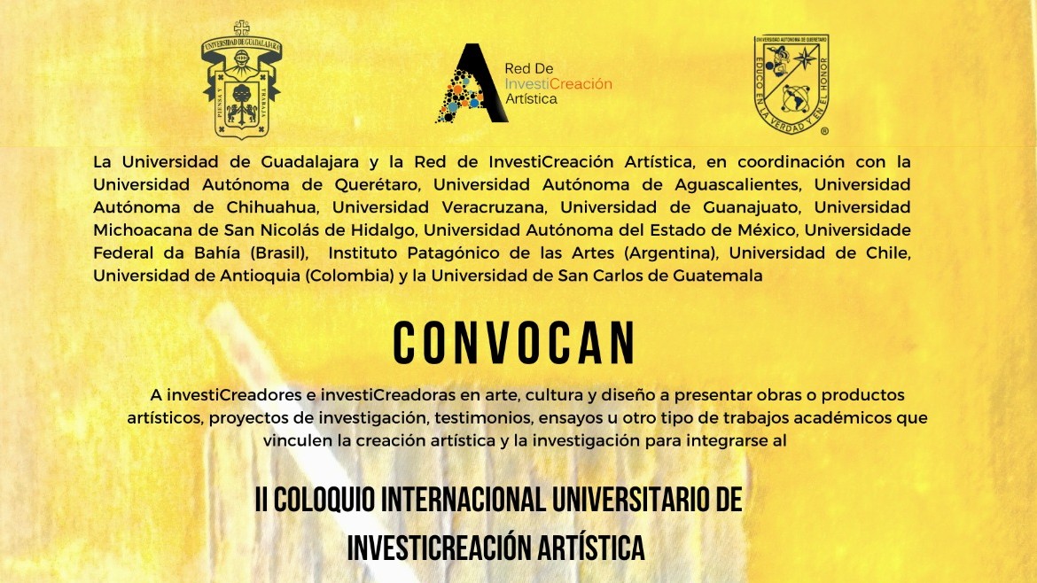 El II Coloquio Internacional de InvestiCreación Artística Universitaria es organizado por la Universidad de Guadalajara, Red de InvestiCreación Artística, Universidad Autónoma de Querétaro, Universidad Autónoma de Aguascalientes, Universidad Autónoma de Chihuahua, Universidad Veracruzana, Universidad de Guanajuato, Universidad Michoacana de San Nicolás de Hidalgo, Universidad Autónoma del Estado de México, Universidade Federal da Bahía (Brasil), Instituto Patagónico de las Artes (Argentina), Universidad de Chile, Universidad de Antioquia (Colombia), Universidad de San Carlos de Guatemala.