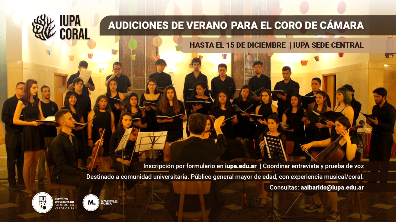 IUPA Coral convoca cantantes en todas las cuerdas (soprano, alto, tenor, bajo) para reforzar la temporada 2024 del Coro de Cámara del IUPA, e invita a la comunidad roquense a participar de su audición pre-receso de verano.