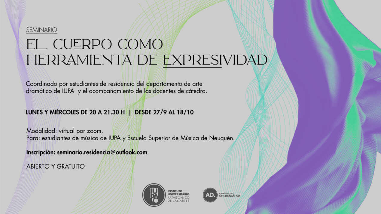 Esta propuesta está orientada a estudiantes de Música de IUPA y de la Escuela de Música de Neuquén, de modalidad virtual vía Zoom, que se desarrollará los días lunes y miércoles de 20:00 a 21:30 desde el 27 de septiembre al 18 de octubre, coordinada por estudiantes de la Residencia del Departamento de Arte Dramático y el acompañamiento de las docentes de cátedra.