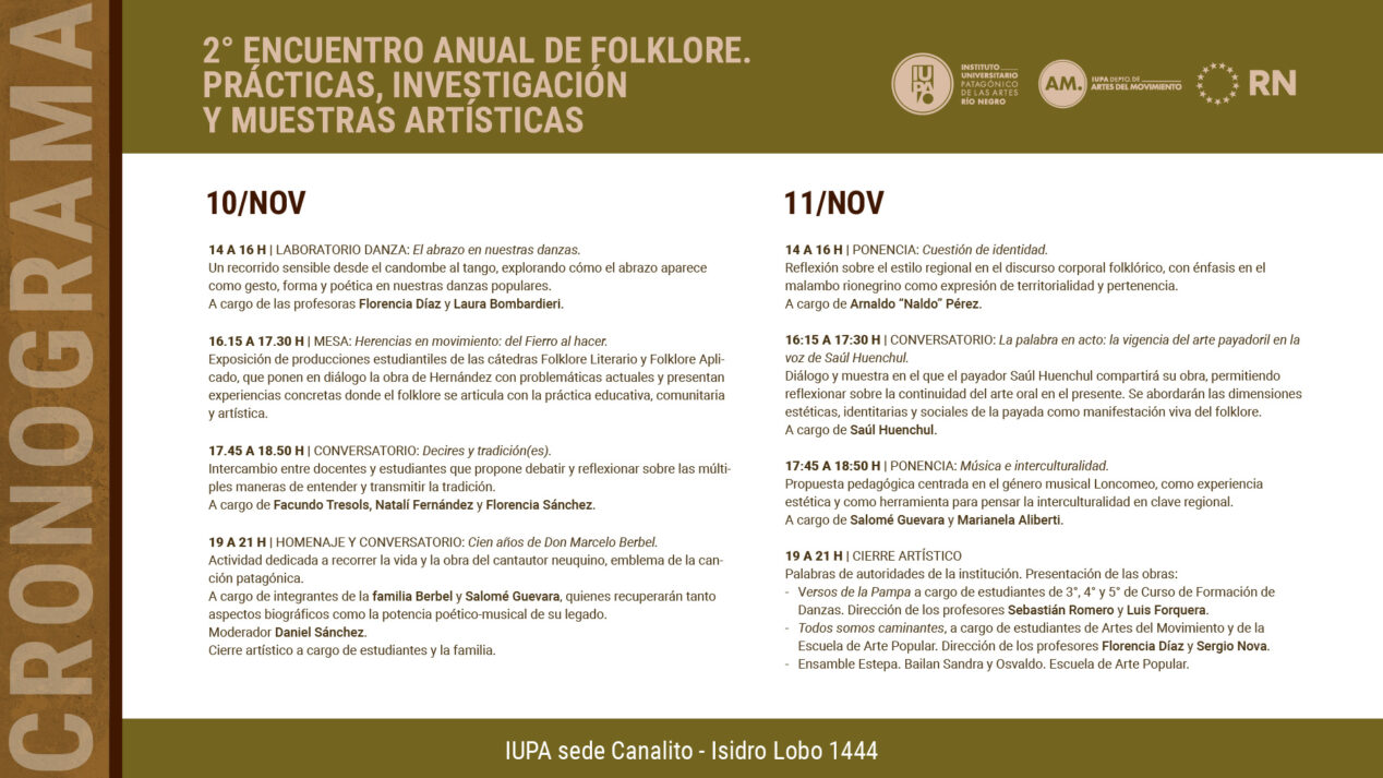 En el marco del Día de la Tradición, el Instituto Universitario Patagónico de las Artes llevará adelante el 2º Encuentro Anual de Folklore. Prácticas, investigación y muestras artísticas, una propuesta que reunirá a docentes, estudiantes, graduados y la comunidad en general en torno a la música, la danza y la cultura popular argentina.