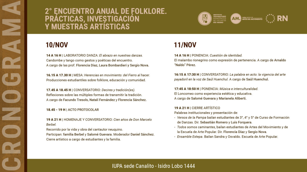 En el marco del Día de la Tradición, el Instituto Universitario Patagónico de las Artes llevará adelante el 2º Encuentro Anual de Folklore. Prácticas, investigación y muestras artísticas, una propuesta que reunirá a docentes, estudiantes, graduados y la comunidad en general en torno a la música, la danza y la cultura popular argentina.