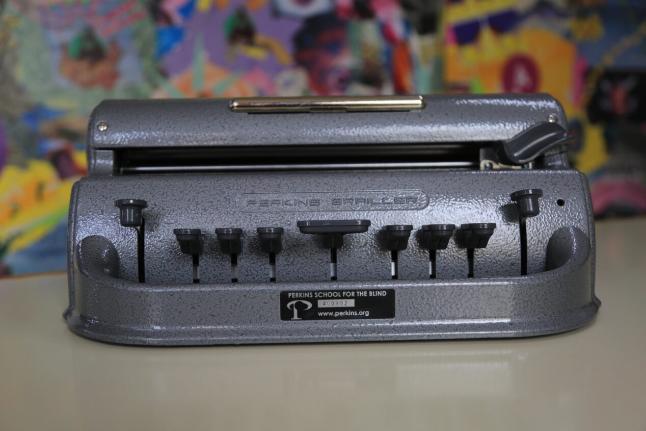 La universidad compró una máquina Perkins, un equipo de escritura en Braille que agiliza la escritura. Tiene seis teclas y funciona como una máquina de escribir convencional.