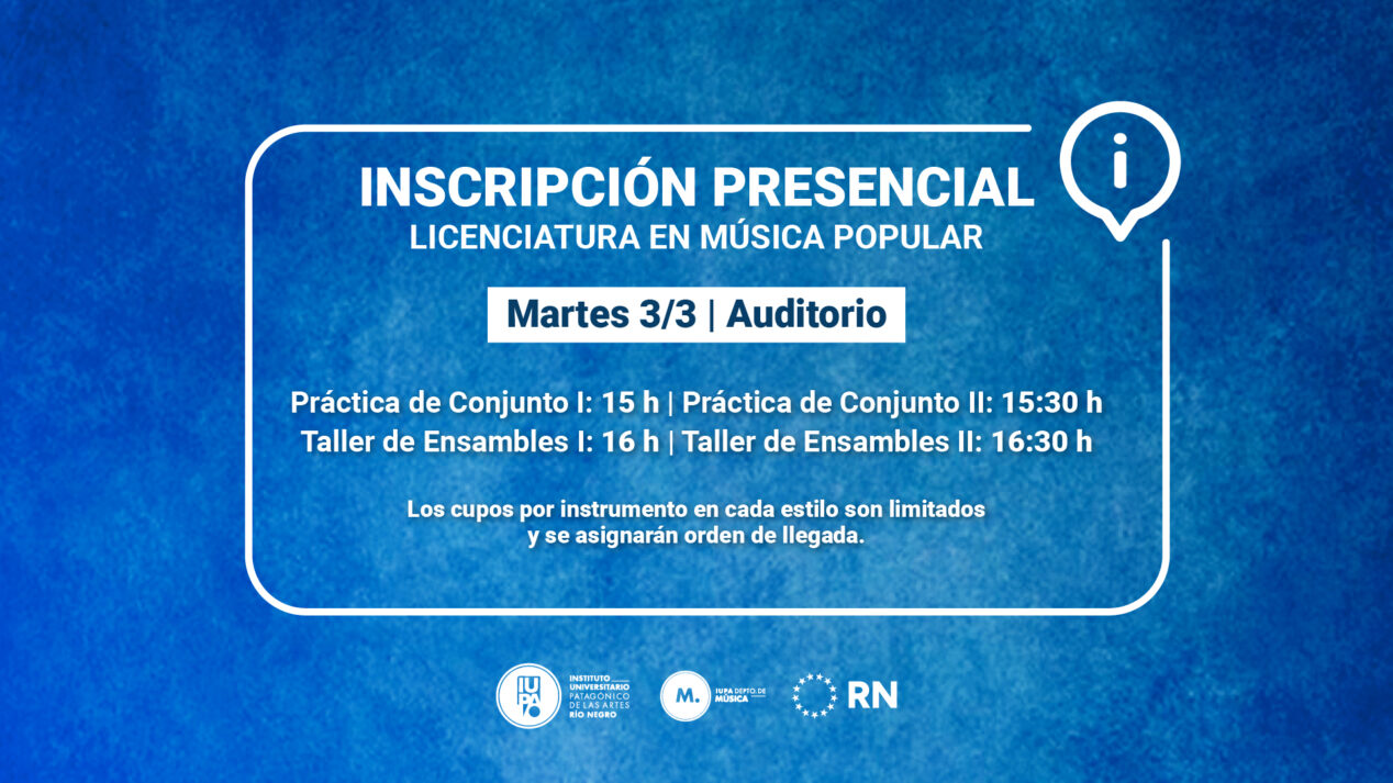 El Departamento de Música informa que la inscripción a las asignaturas Práctica de Conjunto (I y II) y Taller de Ensambles (I y II) de la Licenciatura en Música Popular se realizará de manera presencial.