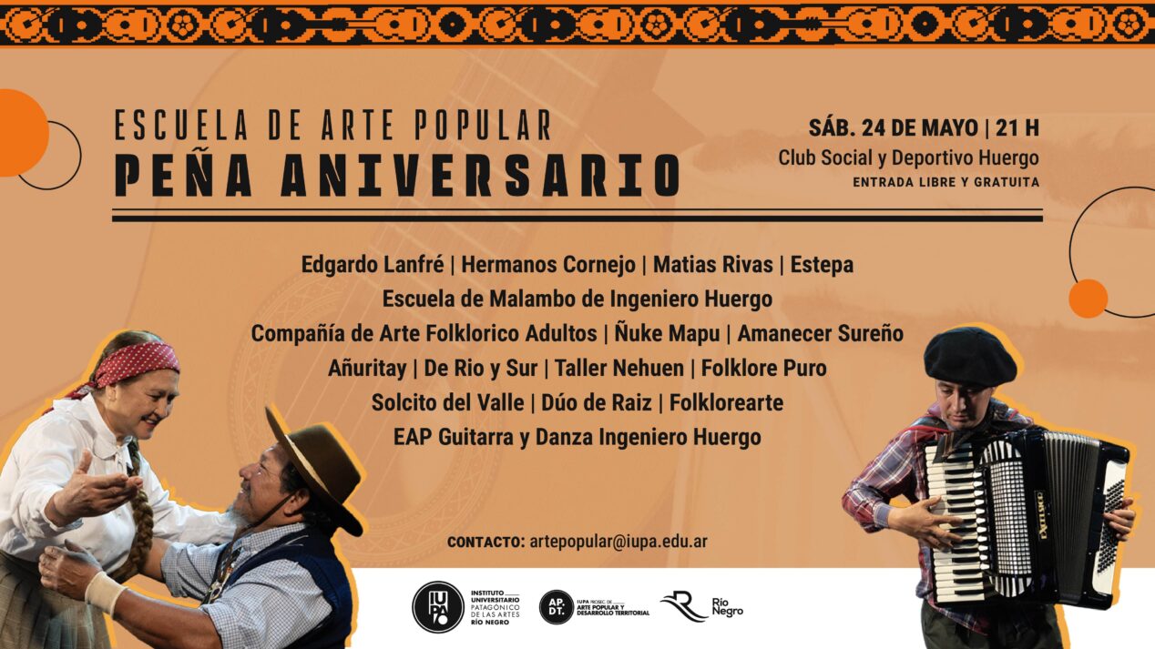 Luego, el día 24 de mayo, se realizará una peña aniversario en la localidad de Ingeniero Huergo. La propuesta es para toda la comunidad, de ingreso libre y gratuito. Se presentarán diversos artistas, desde las 21 horas en CDI Iglesias – Club Social y Deportivo Huergo.