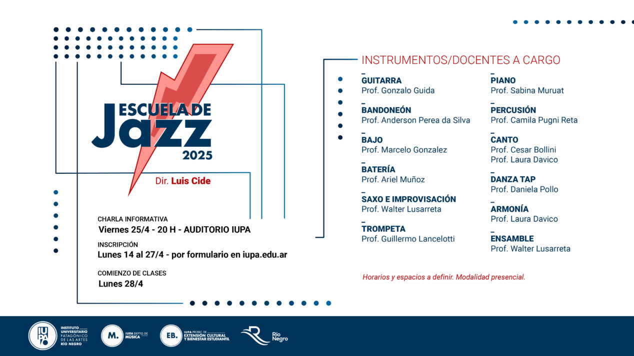 El Instituto Universitario Patagónico de las Artes lanza una nueva edición de la Escuela de Jazz, un espacio formativo que combina instrumentos, improvisación y ensamble, destinado tanto a estudiantes y docentes del IUPA como a personas de la comunidad interesadas en sumergirse en el universo del jazz.