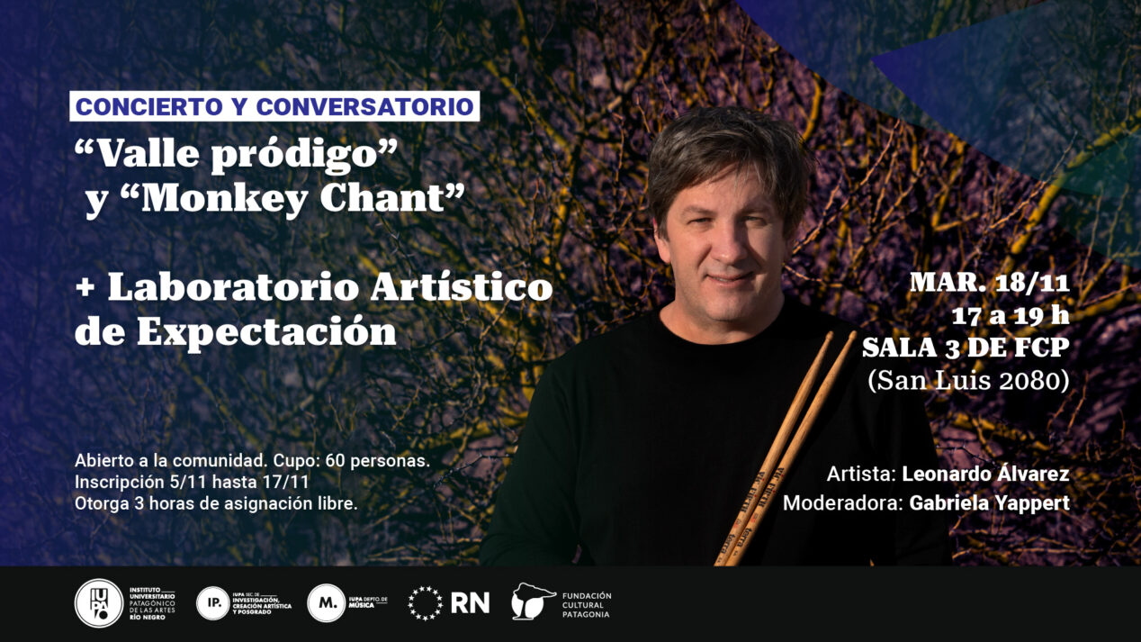 La jornada incluirá la presentación y análisis de dos obras: Valle pródigo, una composición abierta para batería o percusión solista, y Monkey Chant, pieza para batería y medios electrónicos del reconocido baterista Glenn Kotche (Wilco).