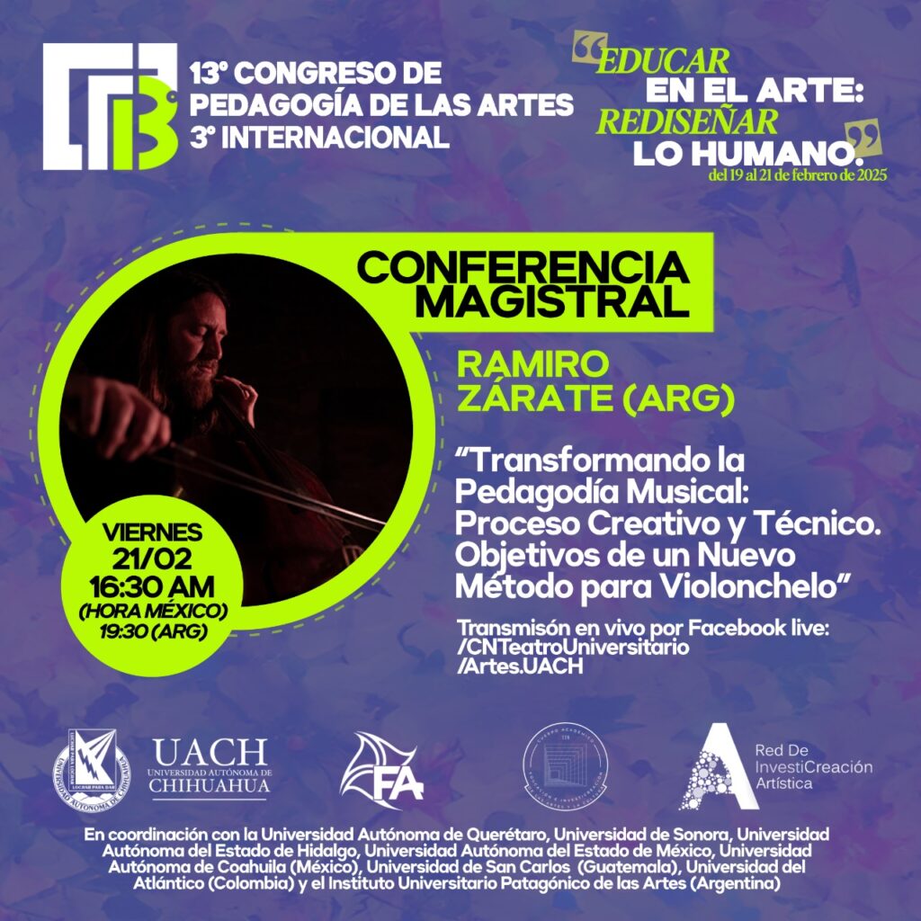 Nuestra presencia será a través de una conferencia magistral, a cargo de nuestro docente de Música Ramiro Zárate Gigli. Transformando la Pedagogía Musical: Proceso Creativo y Técnico. Objetivos de un Nuevo Método para Violonchelo es el tema que nuestro profesor expondrá ante artistas, investigadores y docentes de distintos países.
