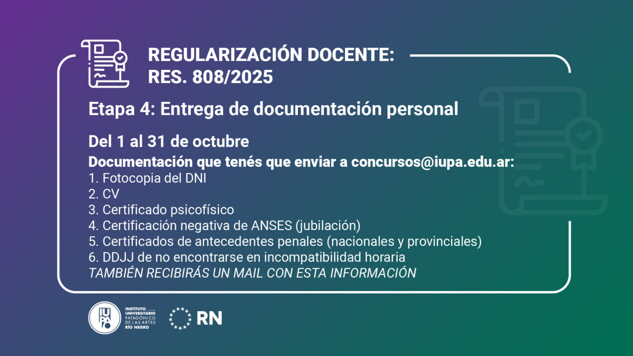 El IUPA informa que, en el marco del proceso de concursos cerrados de antecedentes curriculares (Resolución N° 808/25), se inicia una nueva etapa correspondiente a la entrega de documentación personal.