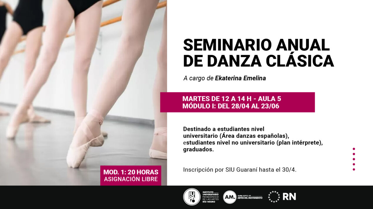 El Departamento de Artes del Movimiento del Instituto Universitario Patagónico de las Artes (IUPA) organiza el Seminario anual de danza clásica, una propuesta de formación orientada al desarrollo técnico y artístico en el campo de la danza académica.