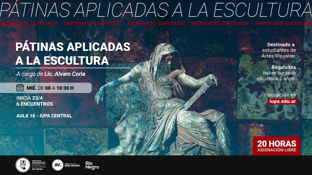 El Departamento de Artes Visuales del IUPA presenta el Seminario de pátinas aplicadas a la escultura, una propuesta presencial de asignación libre. El seminario se orienta a estudiantes de Artes Visuales que cumplan los siguientes requisitos: haber cursado Escultura dos años (ya sea desde Taller