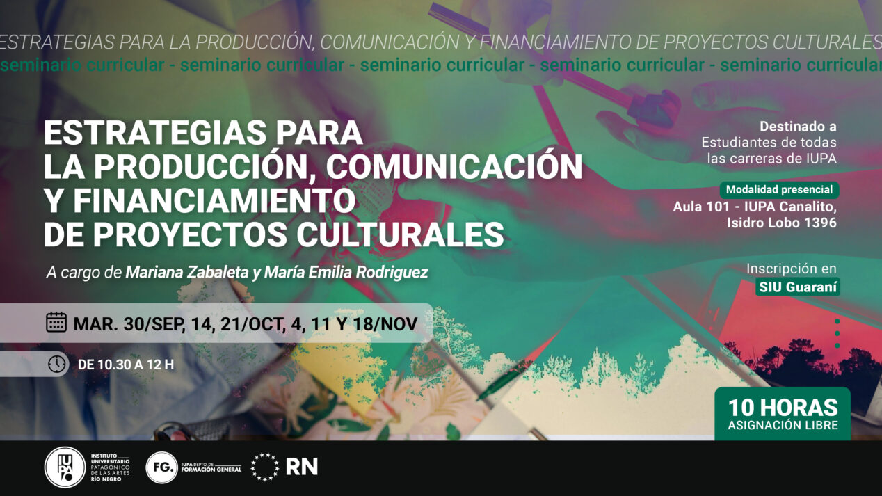 El IUPA abre la inscripción al seminario Estrategias para la producción, comunicación y financiamiento de proyectos culturales, una propuesta destinada a estudiantes regulares de todas las carreras de la institución que deseen fortalecer sus herramientas para el desarrollo de iniciativas artísticas y culturales.