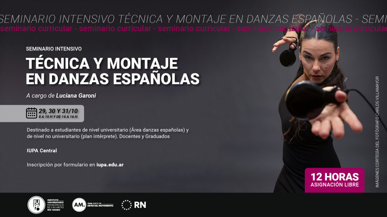 El Instituto Universitario Patagónico de las Artes invita a participar del Seminario intensivo de técnica y montaje en danzas españolas, que se realizará los días miércoles 29, jueves 30 y viernes 31 de octubre, de 8 a 10 h y de 14 a 16 h, en la sede central de IUPA.