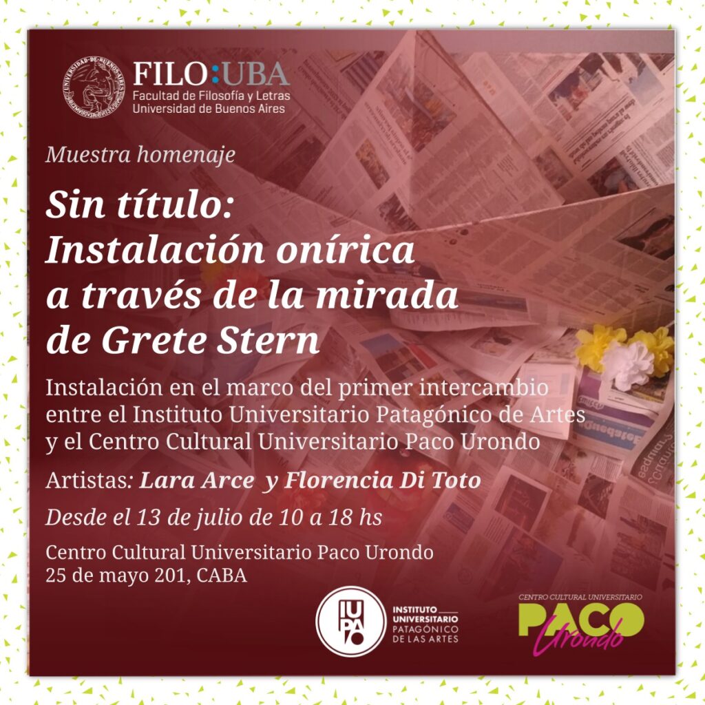 Sin título: instalación onírica a través de la mirada de Grete Stern inaugurará el 13 de julio a las 18 horas en el Centro Cultural Paco Urondo (CCPU), de la Facultad de Filosofía y Letras de la Universidad de Buenos Aires (UBA), donde podrá visitarse hasta el 25 de este mes.