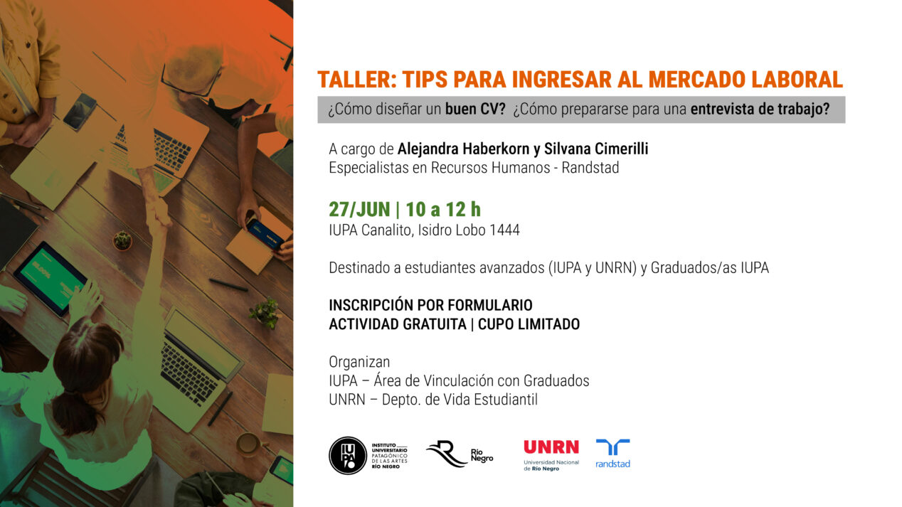 Diseñar adecuadamente un currículum vitae (CV) y prepararse correctamente para una entrevista de trabajo son dos de los tres puntos clave que constituyen el Taller: Tips para ingresar al mercado laboral, una propuesta elaborada por el Área de Vinculación con Graduados del IUPA en conjunto con el Departamento de Vida Estudiantil de la Universidad Nacional de Río Negro (UNRN). La actividad estará a cargo de especialistas en Recursos Humanos de Randstad, consultora de relevancia nacional e internacional de RRHH.
